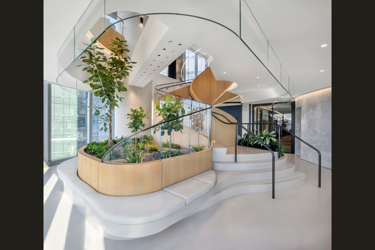 Completed in 2025, this innovative staircase installation at a global law firm’s New York City office transforms a simple architectural feature into a vibrant living park. The space incorporates integrated irrigation discreetly hidden behind a removable millwork panel, allowing for easy refills and automated watering—ensuring low-maintenance care while keeping the focus on aesthetics. A dynamic mix of plant clusters, built-in millwork planters, and sculptural green dividers creates a multi-sensory experience ideal for mental refreshment amid a day of complex legal work. This biophilic intervention elevates circulation space into a destination—offering moments of calm, curiosity, and connection in the flow of a busy office.